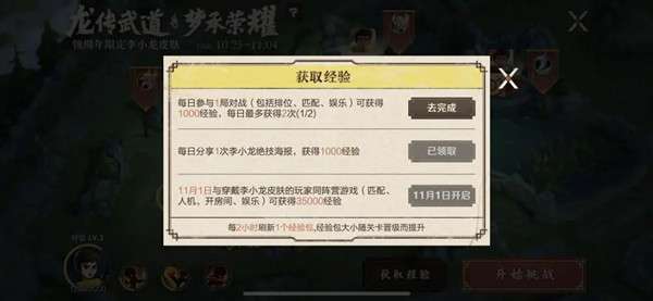 如果你不想浪费时间,每天去打两局游戏的话,你可以选择在11月1日再参与,因为在那一整天,只要跟有李小龙皮肤的玩家同阵容游戏,就可以获得35000点经验。直接连续升级,一天就能直接通关到第4关,无须每天守着领取2小时刷新的实时经验包。