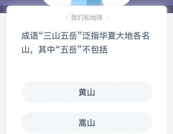 蚂蚁庄园在12月13日更新了两道题,成语三山五岳泛指华夏大地各名山其中五岳不包括,一般是包括哪些呢,到底是黄山还是华山呢,下面就来介绍下正确答案。