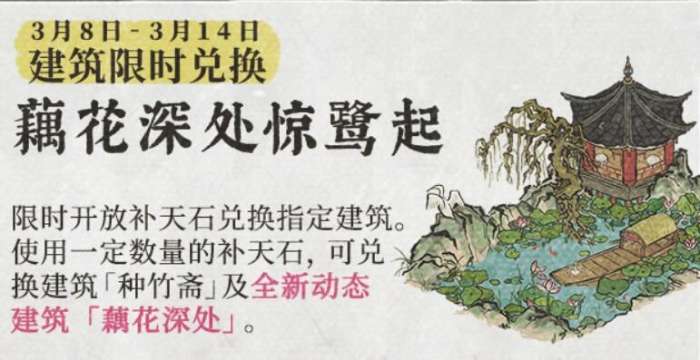 1、限时开放补天石兑换指定建筑。使用一定数量的补天石,可兑换全新动态建筑「藕花深处」。
