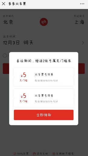 2、这样就能进入拼多多火车票,进行购买火车票啦,如果用户是新用户的话,还有红包拿哦!