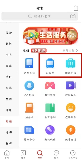4、同时小编提醒在拼多多在【搜索频道】的【充值】细分栏目下,也设置了多多火车票的通道口。