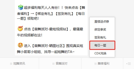第一步、打开【QQ炫舞手游】公众号,在下方的菜单栏中选择【舞者福利】-【每日一题】,触发每日一题活动