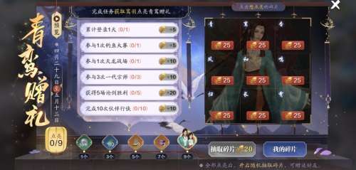 4月29日-5月13日,完成任务池中的任务将获得对应数量的鸾羽奖励,每个任务限完成一次。鸾羽可用于在右侧奖池中点亮碎片,点亮相应数量的碎片后可在页面下方领取对应的奖励。活动开启一周后开启“赠送”功能,将碎片全部点亮的玩家可通过点击“抽取碎片”获得随机碎片并赠予有需要的好友。