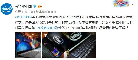 为了拉近和用户的距离,很多官博都在想各种方法,比如英特尔中国官方微博,现在快成硬件知识的小科普站了,今天还为大家科普了一下,电脑睡眠和关机该如何选择的问题。