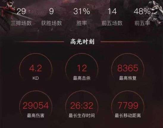 最后就能看到自己的战绩情况了,记录着详尽的三排场数、获胜场数、胜率、场均表现。如果你知道其他角色的id,还能查询他的战绩,所以这个查询器是非常方便的。