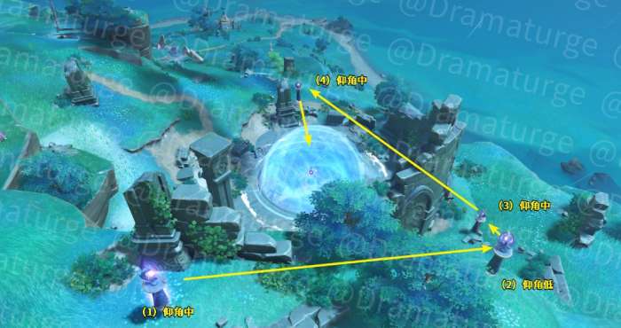 解谜方法:调整好「雷承之鉴」和「御引磐座」的角度和方向后,攻击「御引磐座」发射电流。电流通过「雷承之鉴」的传导,最终射击并消解在八酝岛的崇神意志下,形成的结界。