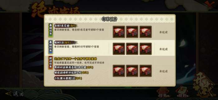 这个模式每天刷新,且刷新三个宝箱,可以获得金币,忍者碎片(从S到C)以及其他材料。