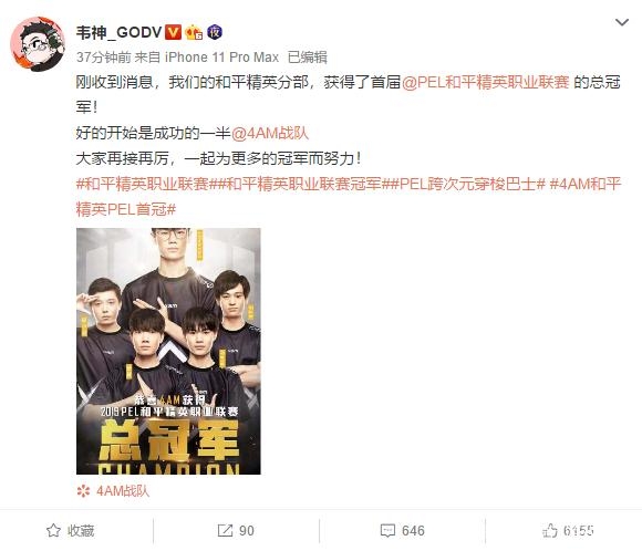 而在4AM夺冠之后,隔壁正在比赛的老板韦神也是发来祝贺,直言接下来继续努力,拿到更多的冠军!但网友评论区的回复就很有意思了,网友们都在陶侃,正在比赛的阿韦哪有时间发动态,肯定是老板娘蜜蜂仔发的,而且也调侃大猪们多学学,mini猪已经拿到冠军了,阿韦不得也捧个杯赛奖杯回家。