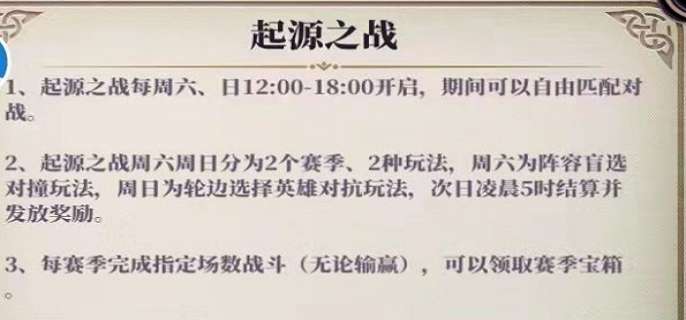 3、这套阵容不含神魔,都能拿到,赢也容易,当然你要是有魔族选满魔族也可以。起源之战时间:每周末12:00——18:00,这个打满每周奖励上限,和拿满赛季宝箱就可以