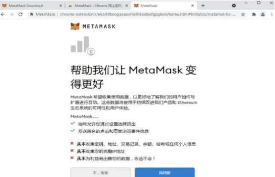 6.选择是否愿意共享一些使用数据给MetaMask时选是否都可以。