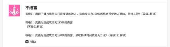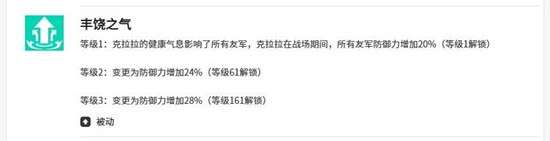 是一个团队防御向的被动技能。在战斗中有概率触发,触发后能提升我方全体队友20%的防御力,在面对高爆发敌人时能为团队争取更多生存空间。该效果在最高品质下,防御力加成可提升至28%。需要注意的是,这个增益效果通常在敌方行动的回合才有机会触发。
