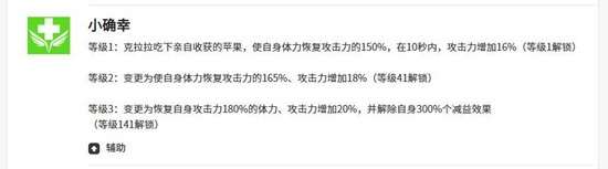 是一个强力的自我恢复与增益技能。克拉拉通过制造并食用一个苹果,为自身恢复基于攻击力150%的体力。不仅如此,在接下来的10秒内,她还能获得16%的攻击力加成,从而提升自身的输出能力。当该技能达到等级三时,使用后还能解除自身身上的减益效果,解除量高达300%,这让她在面对敌方debuff时拥有很强的自保能力。
