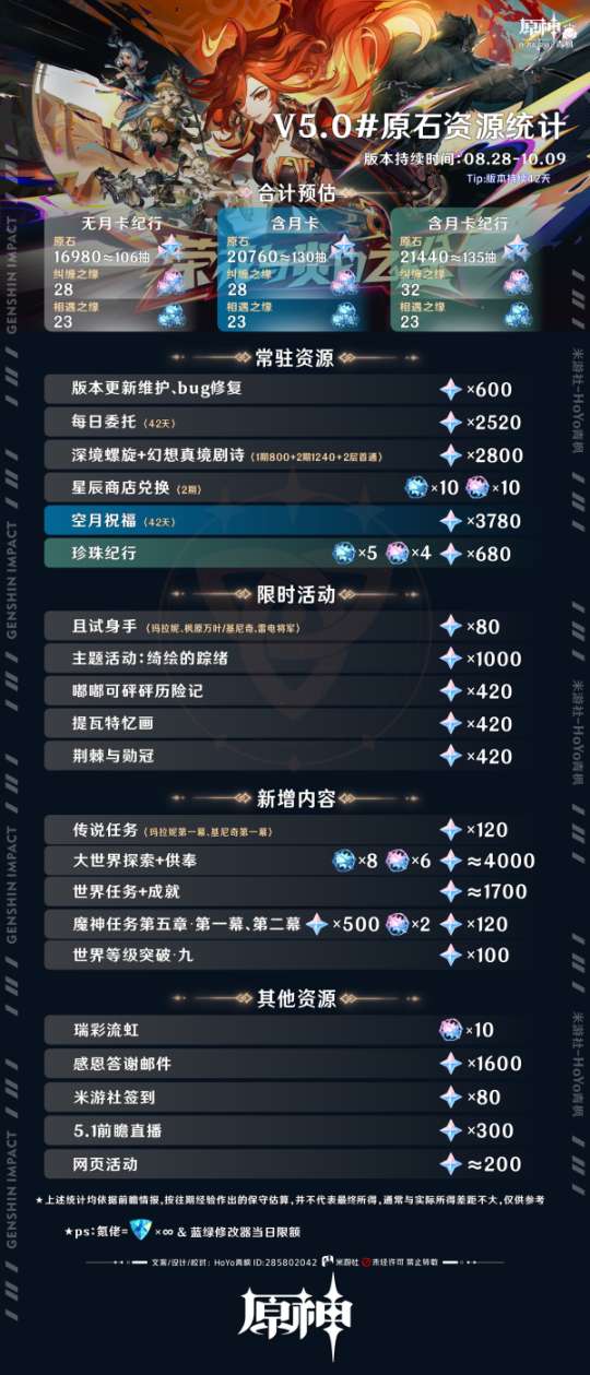 资源统计是根据前瞻总结,结合以往经验做出的预估算,通常实际所得会略高于本统计,差距不大可结合自身情况做出相应的估算;