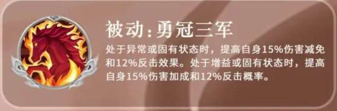 最后的一个被动叫做勇冠三军,这个被动是在颜良被敌人影响到,也就是敌人有异常状态或者是固有状态施加到颜良身上的时候,就可以触发,此时的话,颜良会用到勇冠三星这个技能,来给自身提升15%的伤害减免效果,同时带来的是12%的反击效果,那么如果他是处于增益以及固有状态当中的话,这个效果还会提升他自身15%的伤害,带来的12%反击概率也是能够给对面带来更多输出影响的,在灵符上面,比较推荐大家给他搭配一些韧性生命灵符或者是闪避防御灵符,如果没有的话也可以用抗性敏捷灵符来跟他带来加成,技能选择上面可以搭配强命、洁净以及快速这些额外的技能都是比较适合他来使用的。