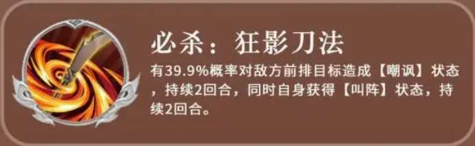 所以目前对于颜良来说,是一个具有强大嘲讽以及反击能力的特征优势,那么作为一名防御武将来用颜良的话,首先要注意他的第一个必杀技,他的必杀技叫做狂影刀法,这个技能有39%左右的概率,可以给敌方的目标造成嘲讽的影响状态,当然这个目标覆盖的敌人区域是前方一排的敌人,这个嘲讽在敌人身上生效的时间达到了两个回合,同时在原谅他自身状态增益上面会获得一个叫阵的状态,这个矫正也会给他自身带来足够的强化,这个叫阵状态的时间也会持续两个回合。