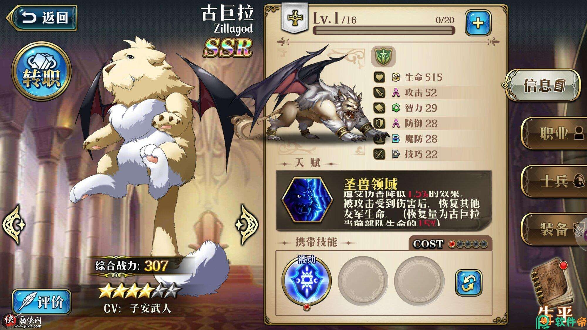 天赋—圣兽领域:每损失一个士兵,则英雄获得遭受伤害降低1%的效果,被攻击受到伤害后,回复其它友军生命。(恢复量为古巨拉当前部队生命的10%)。