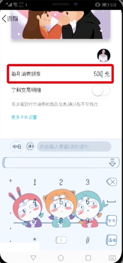 7、输入每月的额度,点击“更多卡片设置”;