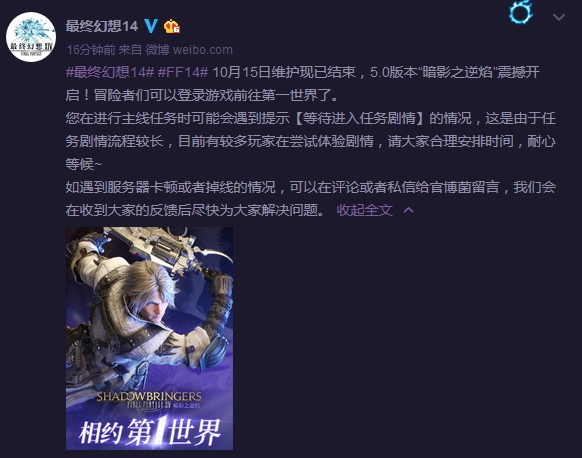 目前,10月15日维护现已结束,5.0版本“暗影之逆焰”震撼开启!冒险者们可以登录游戏前往第一世界了。