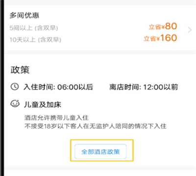 3.选择一个你想要去的酒店,往下滑动,点击全部酒店政策