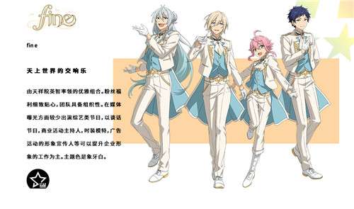 音乐组合隶属于STARMAKER PRODUCTION事务所,是由天祥院英智率领的优雅组合。fine的粉丝福利细致贴心,团队具备组织性。四位音乐学员在团队中和睦相处,一起为粉丝们带来各种细致贴心的福利!相信你一定会喜欢优雅又细致的音乐组合fine!