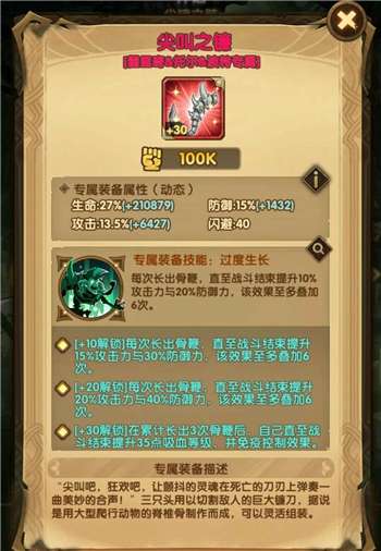 评价:这个专属技能主要是联系着前面的技能一起来看,3技能碎骨鞭,大招和4技能长骨鞭……之前就看着循环往复的背后一定别有深意,这不就是加buff来了。不断提升的攻击力与防御力,更加落实了它的战士定位,越战越勇的特性。开了专属30之后的吸血效果跟免疫控制技能,让其更加肆无忌惮了。