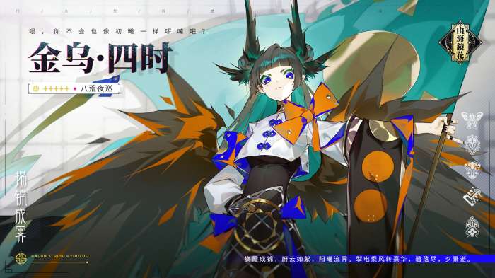 金乌·四时遗传了母亲羲和叛逆强悍的性格,非常特立独行,更不会听从姐姐的教诲。因为最早学会飞翔,她也喜欢上了空中自由宁静的感觉。因性格使然,着装非常桀骜不驯,偶尔还会离家出走。尽管这样,四时在天空中翱翔后想通了,便会回去。回去也不忘给大家捎份礼物,因为在她的内心里,她还是很爱哥哥姐姐们的。