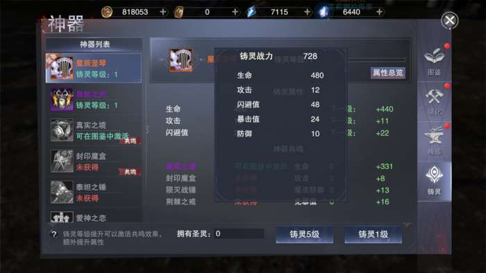 铸灵升级所需货币圣灵可以通过个人首领玩法获得。所有已经收集的神器都可以进行铸灵,永久增加人物属性,神器铸灵需要消耗圣灵,圣灵可通过暴风幻境、大秘境获得。每个神器有4个共鸣,收集共鸣所需的神器可以激活共鸣属性,共鸣下神器的铸灵等级每当同时提升5级,共鸣等级会自动升级,提升命魂的共鸣属性。