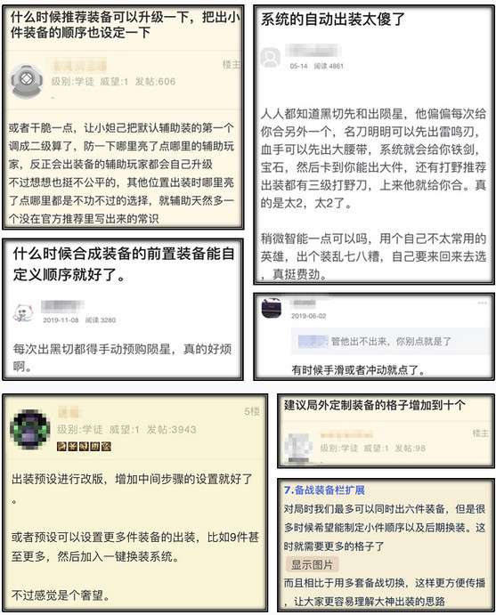 此外我们在各类社区中,还看到了很多召唤师希望个性化地控制大件合成路径、配置后期保命装的替换的建议,给了我们不小的启发: