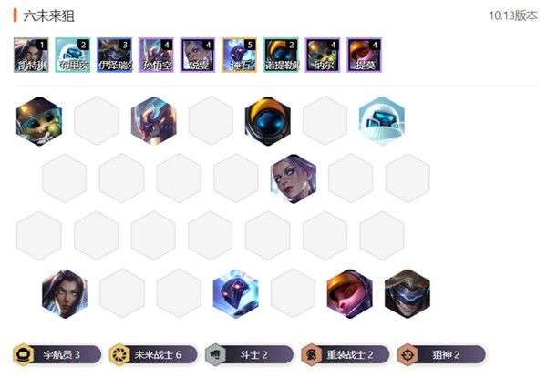 如果凑不到上面阵容,就以4未来+2狙神为主要目标,低配版就是女警+慎+卡牌+机器人,前排补两个重装,或者配合巴德组三宇航员。