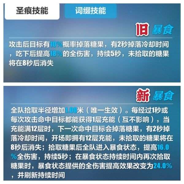 但是除此之外,便是关于糖上限的削弱,从对比图中可以得知,旧糖是可以无上限叠加的,但是加成时间分开计算,而新糖则是拥有两糖24%全伤的峰值,并且持续时间可以通过捡糖来刷新,这影响的便是那些需要靠糖来硬提伤害,达到极限分的双糖以上流程,