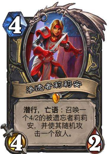 潜行、亡语:招唤一个4/2的被遗忘者莉莉安,并使其随机攻击一个敌人。