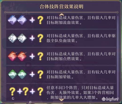 阵营之间各有特色,从他们的合体技就能看出端倪。一般而言,各阵营关联性比较强的特性如下:
