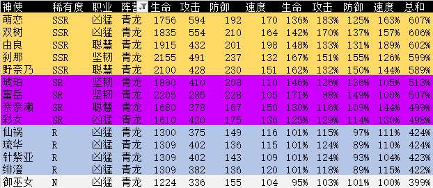 下面有我估算的,不同稀有度神使的属性的相对对比。前期练一些不错的R卡,对于开荒其实挺有帮助的。