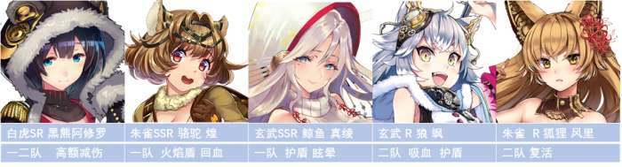 最强团控,群体30%概率冰冻,配合玄武队的合击,基本上能控住敌方大部分角色。但是受限于稀有度,既没有输出,耐久也不行。属于对策型神使。