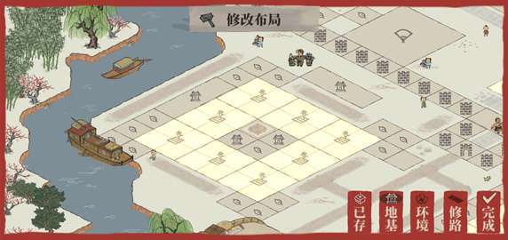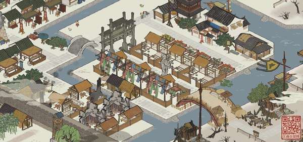 一条大道连通城门和大桥,贯穿商业区,沿线两边都是商铺。不要问我为什么每个店都是2个,我可能有强迫症,好事成双嘛哈哈哈哈哈哈(我也想过比较各店铺的钱币收成性价比,前期发现想建的店物资跟不上,后来觉得算来算去好麻烦,算好了也不记得,下次还是随机点工作,就佛了,一视同仁叭