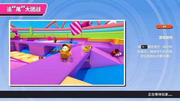 团队抓尾巴,分四队,因为人多而且分四队场面相当混乱。尽量持有尾巴的时候躲好,可以在旋转的场景中心躲避,没有尾巴的话就要抓紧了,在时间结束之前没有尾巴就会淘汰。