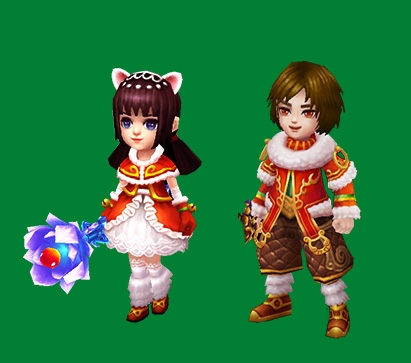 接下来我们再看看新年时装。这套时装主色调是暖暖的大红色,代表新年的喜庆气氛;剩余的白色则代表着瑞雪,毕竟瑞雪兆丰年嘛!男性时装穿得相当厚实,脖根处一圈大羊绒看上去就十分暖和,也显得相当富贵;女性则手戴大红手套,脚穿羊绒靴子,一身红白相间的连衣裙,一双猫耳朵不失可爱,尽显贵族大小姐风范。