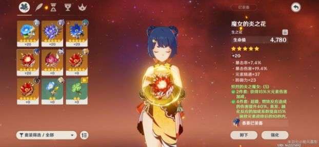 圣遗物的选择可以根据自己的习惯选择魔女套或者逆飞的流星,再或者角斗士。