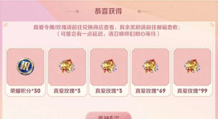 那么需要多少点券可以攒够398玫瑰兑换令牌呢?小编试抽后发现,虽说得到9朵玫瑰的概率最高,但也出现了69或99朵玫瑰,差不多1500点券可以得到350-450朵玫瑰,值得一提的是官方还为玩家准备了免费获取真爱玫瑰的任务,比如完成小乔周瑜熟练度达到绿色、拥有周瑜小乔、使用周瑜小乔参与对局以及消耗钻石等任务可额外领取8个玫瑰,也就是说兑换一款皮肤保底150块,当然脸黑的小伙伴可能会消耗更多点券,也有玩家消耗更少点券甚至直接抽到令牌!