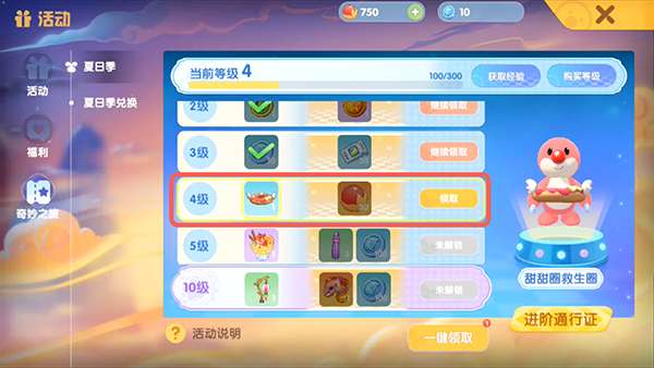 甜甜圈救生圈是一个类似于冲浪板的道具,在水中也可以提升移动速度,而且速度不比冲浪板慢,最重要的是,甜甜圈救生圈是白嫖的,在夏日季中,完成两天每日任务获得夏日经验值就可以领取到,大家也可以选择花50金豆购买夏日季等级。