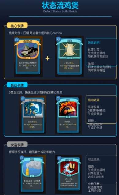 就是多抓产生负面状态的牌,力大砖飞,这类牌数值高,负面状态可以被利用转化,前期好过渡,不刚需金卡和遗物,一手烂牌就能赢,很容易伪无限,唯一的难点是能否抓到压缩(这代随机数有点奇怪,有时候三四把见不到想要的卡),如果实在找不到压缩,可以用刮削硬过,或者那张消状态打伤害的金卡散射炮是下位替代,其次迭代、烟囱、废物利用、火箭飞拳、内核加速无脑抓。