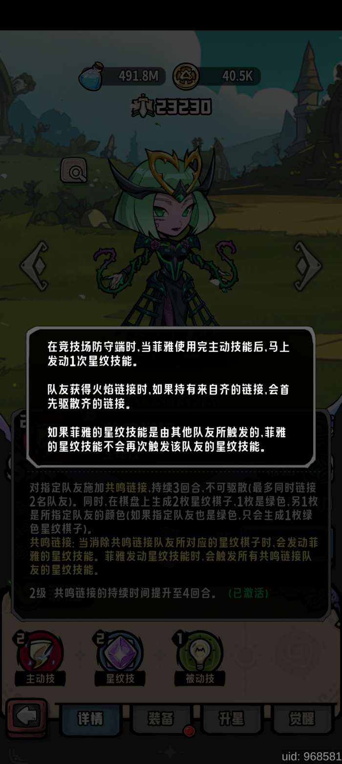菲雅的星纹技在链子存在的情况下,消除绿色或者链接队友的颜色,菲雅都会发动星纹,每次星纹回复1点能量