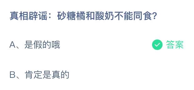 真相辟谣:砂糖橘和酸奶不能同食?支付宝小鸡课堂新的一天答题开始啦!每天只需花一分钟,动动手指答对问题,180g饲料立马到账!2026年4月17日蚂蚁庄园的小鸡课堂题目正确答案是【是假的哦】,砂糖橘和酸奶不能同食是假的。