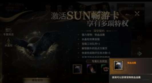 游戏中有很多的宠物,除了大熊猫之外,还有铁血战鹰。玩家如果想要获得铁血战鹰就需要选择激活SUN畅游卡,在激活之后,除了可以获得铁血战鹰,同样也可以解锁专属的商店,可以享受水晶挂文挂纹特权。还可以迅速的叠满伤害buff,冒险也可以直接开无双。