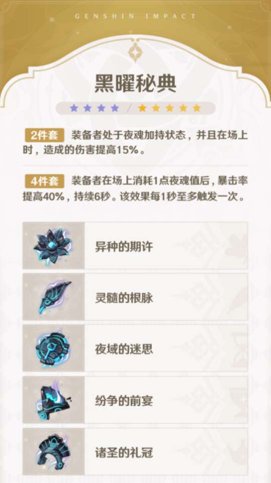 黑曜秘典:纳塔角色专用的站场套,只要有夜魂加持,可以吃满15增伤和40%暴击率。