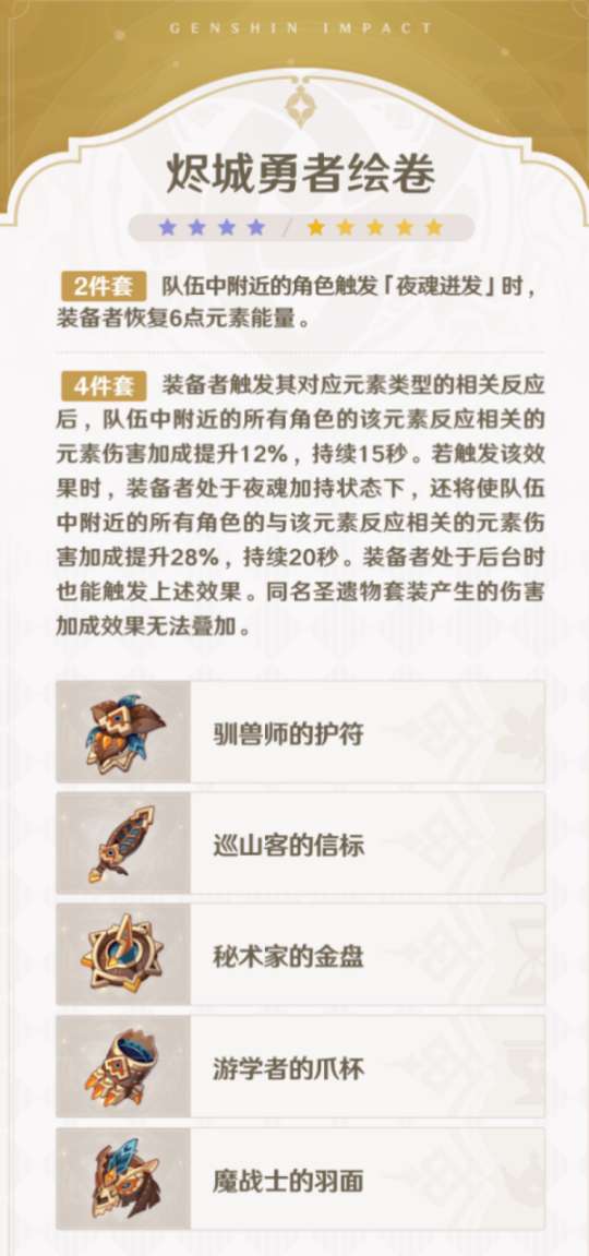 来看看5.0的两套新圣遗物:黑曜秘典+烬城勇者绘卷