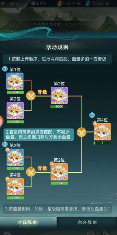 除此之外,还有一些细节需要注意,那就是每个宠物每天只有一次免费的上场机会,因此为了确保本轮比赛能够获胜,小编建议大家尽量把手中战斗力最强,星级最高的宠物给放下去,如果当战斗结束时场上出现了两个打为平手的宠物,那么品质和星级高的一方视为获胜。