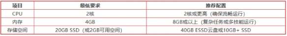 3、存储空间:最低需 20GB SSD(或2GB可用空间),推荐40GB ESSD云盘或10GB+ SSD。