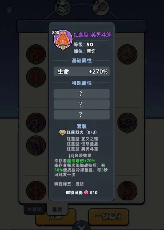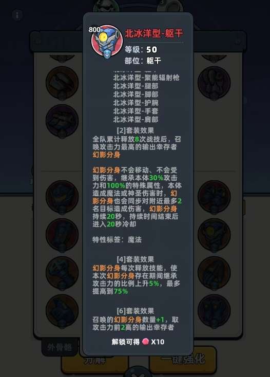 而在其它搭配上,可用北冰洋六件套和擎天型二件套作为外骨骼的外圈配装,擎天型二件套可让玩家获得能量块,以此获得高倍率的物理增伤,北冰洋六件套的幻影分身效果,可有效地强化幸存者的输出,对主打物理或神圣伤害的幸存者能带来极大的提升,与天际砖头无比适配。至于内圈更适合用红莲型三件套,它有50%的概率在幸存者释放战技后立刻重置冷却,且每3秒就触发一次,让幸存者能更频繁地打出物理或神圣伤害,从而更快地完成激发天际砖头所需的前置条件。