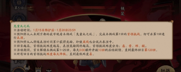 木偶戏'鬼童丸之乱'中,阴阳师大人完成第1回的首领挑战,即可在第1回进行放置表演,并随表演时间累计获得奖励。即使离线也会视为表演中,回目越高奖励效率越高。